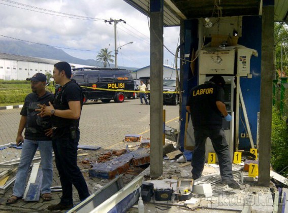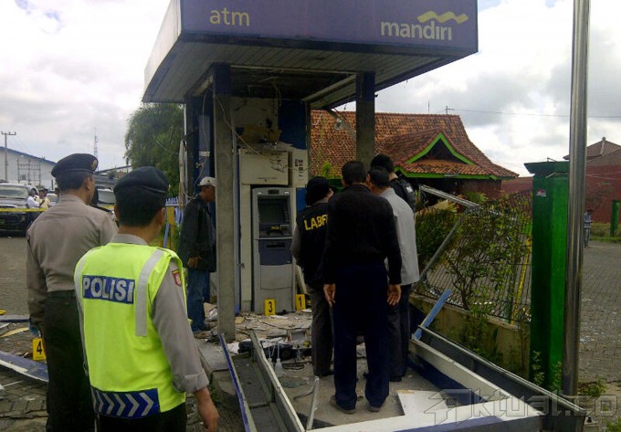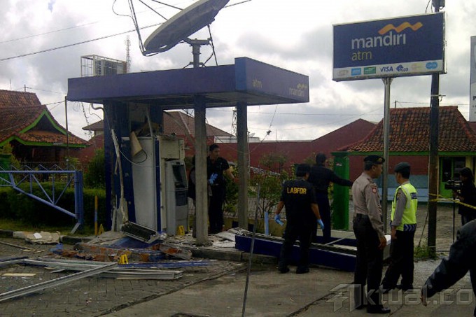 Sejumlah anggota kepolisian memeriksa ruang Anjungan Tunai Mandiri (ATM) yang meledak di Jalan Kartanegara, Karangploso, Kabupaten Malang, Jawa Timur, Kamis (9/1/2014). Ledakan terjadi sekitar pukul 02.30 WIB menyebabkan bilik ATM itu luluh lantak, kaca bilik ATM berhamburan hingga jarak sekitar 20 meter dari lokasi. Dugaan ledakan akibat bom atau aksi terorisme masih terus didalami. Namun, polisi menduga ada upaya perampokan ATM Mandiri tersebut. Aktual/Muchammad Nasrul Hamzah