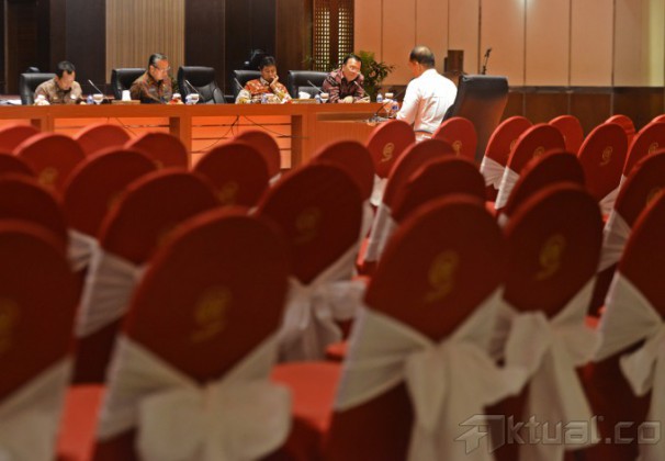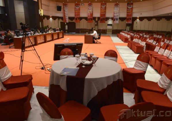 Suasana di ruang wawancara terbuka calon pimpinan tinggi madya dan pratama di Kementerian Hukum dan HAM, Jakarta, (29/5). Wawancara itu merupakan rangkaian proses seleksi setelah tes integritas dan tes kapasitas untuk sejumlah posisi di Kemenkumham diantaranya jabatan Direktorat Jenderal (Ditjen) Pemasyarakatan, Ditjen Imigrasi, dan Ditjen Peraturan Perundang-undangan. ANTARA FOTO/Fanny Octavianus