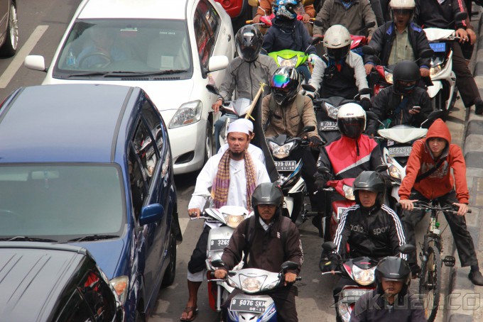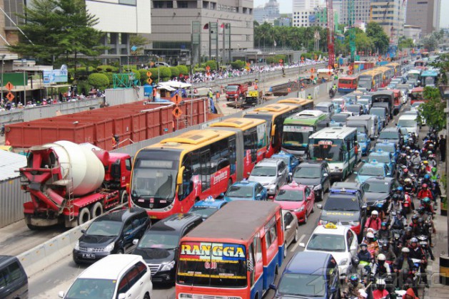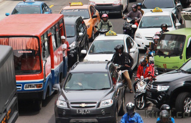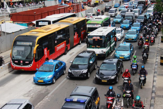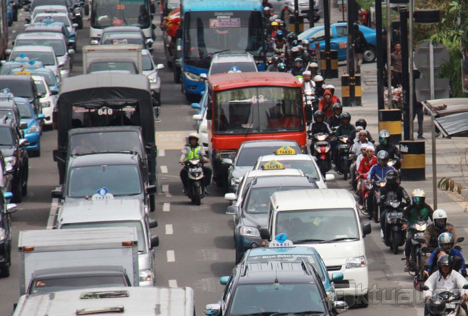 Sepeda motor melintas jalan MH Thamrin, Jakarta Pusat, Senin (1/12/2014). Pemerintah Provinsi DKI Jakarta akan membatasi ruang gerak sepeda motor. Salah satunya dengan membuat larangan melintas jalan MH Thamrin hingga jalan Medan Merdeka Barat pada 17 Desember mendatang. Uji coba ini akan berlangsung sebulan. Setelah itu, hasil uji coba akan dievaluasi untuk dikembangkan ke titik lain. AKTUAL/TINO OKTAVIANO