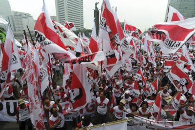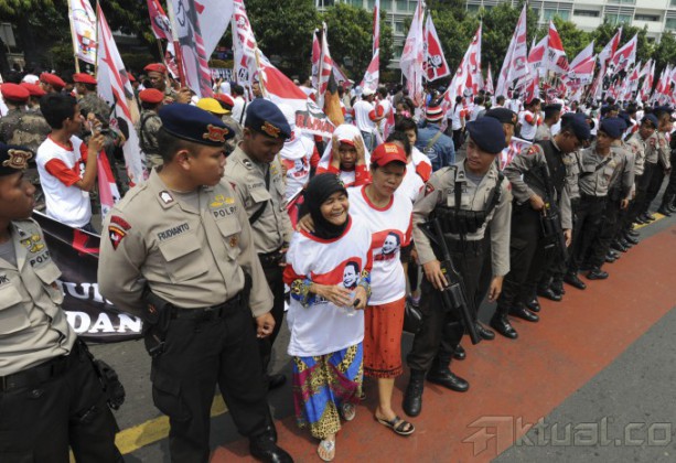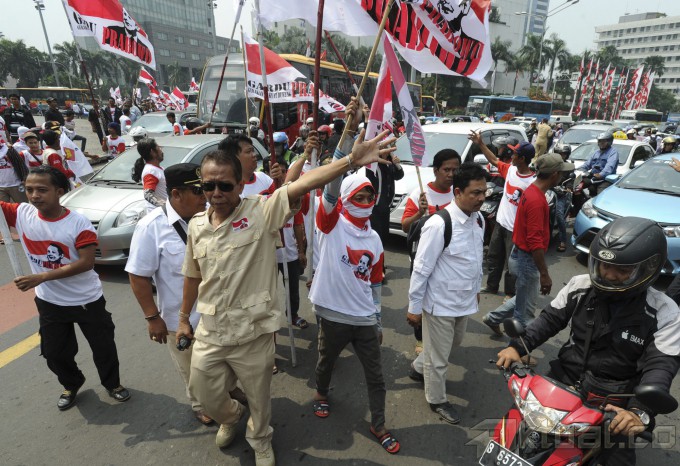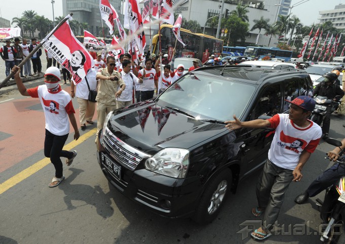 Massa pendukung Prabowo Hatta berkumpul dan menutup arus lalu lintas menuju Harmoni di Bunderan Hotel Indonesia, Jakarta (21/8/2014). Aksi massa akan berlanjut ke gedung DKPP dan Patung Indosat. Aktual/Tino Oktaviano