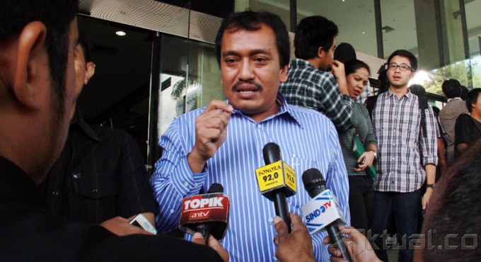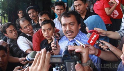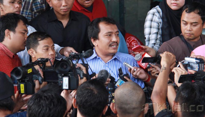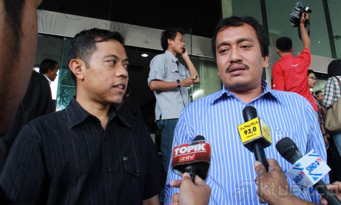 Juru Bicara Perhimpunan Pergerakan Indonesia (PPI), Ma’mun Murod (kanan), didampingi mantan Ketua DPC Partai Demokrat Kabupaten Cilacap, Tridianto (kiri), menjawab pertanyaan wartawan seputar tidak hadirnya Mantan Ketua Umum Partai Demokrat, Anas Urbaningrum yang dipanggil Komisi Pemberantasan Korupsi (KPK), Selasa (7/1/2014). Ma’mun Murod mengatakan Anas Urbaningrum enggan memenuhi panggilan pemeriksaan lantaran belum bisa memahami status tersangka yang ditetapkan KPK. Aktual/Tino Oktaviano