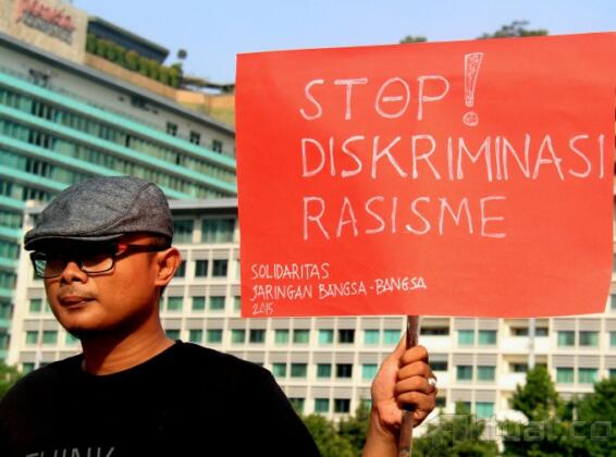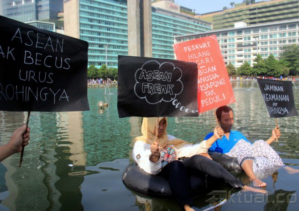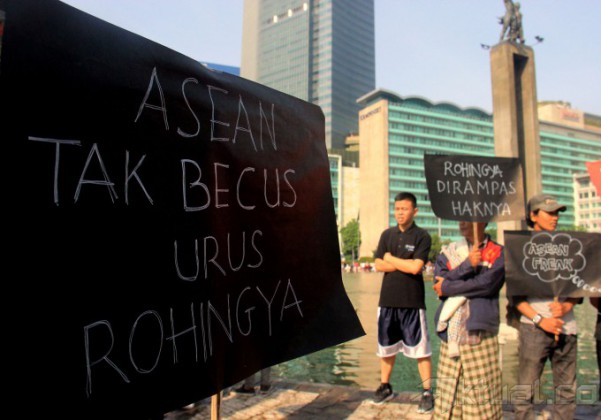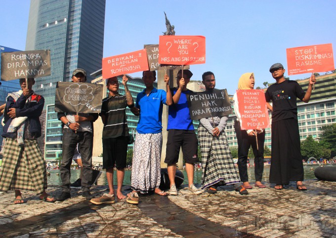 Puluhan aktivis dari Jaringan Solidaritas Bangsa-Bangsa (JSBB) melakukan aksi solidaritas terhadap pengungsi Rohingya di Bunderan HI, Jakarta, Minggu (24/5/2015). JSBB mengkritis sikap ASEAN yang tidak becus mengurus para pengungsi Rohingya dan menolak segala bentuk dikriminasi rasisme. AKTUAL/MUNZIR