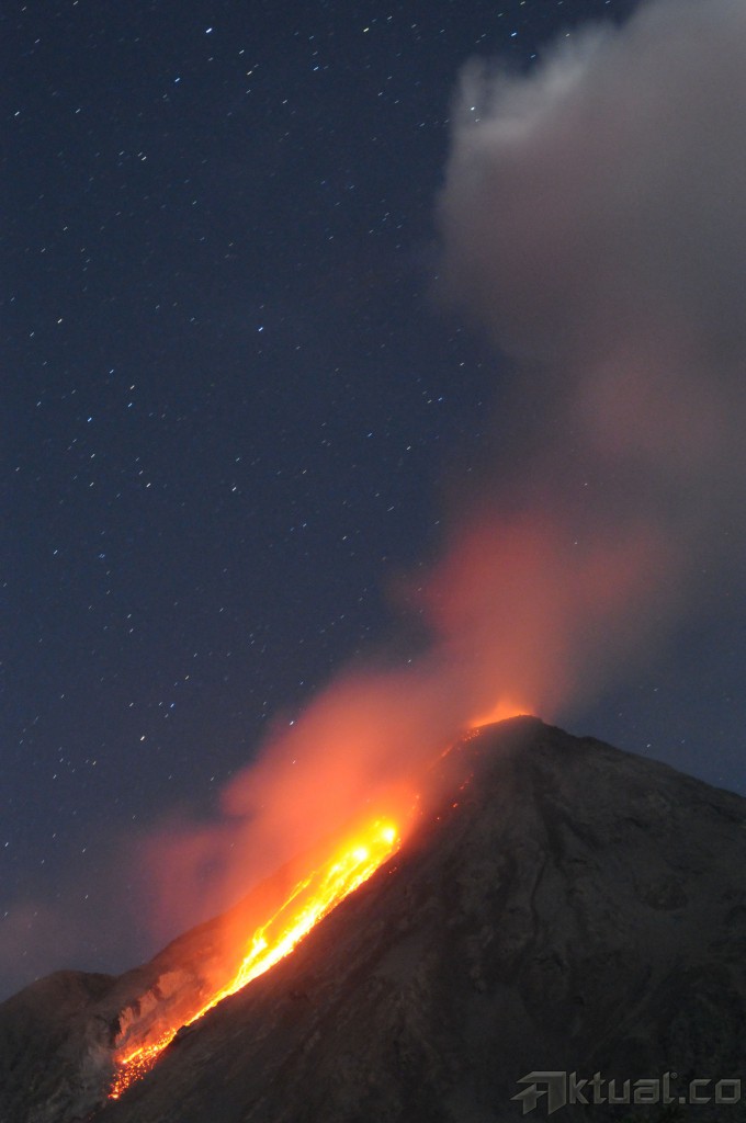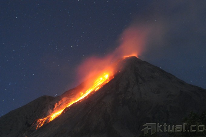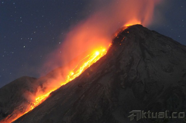 Gunung api Karangetang memuntahkan lava pijar di Siau kepuluan Sitaro, Sulawesi Utara, Senin (11/5) dini hari. Gunung api yang masih berstatus siaga level tiga itu terus mengeluarkan guguran lava mencapai kurang lebih 500 meter dari kawah dengan kegempaan fluktuatif sejak bulan lalu. ANTARA FOTO/Fiqman Sunandar