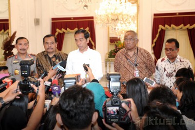 Presiden Joko Widodo (tengah) bersama Wakapolri Komjen Pol. Badrodin Haiti (kiri), Jaksa Agung HM Prasetyo (kedua kiri), dan Plt. Ketua KPK Taufiequrachman Ruki (kedua kanan) menjawab pertanyaan wartawan di Istana Merdeka Jakarta, (25/2). Presiden bertemu dengan pimpinan Polri, Kejagung dan KPK untuk membicarakan sinergi ketiga lembaga tersebut dalam pemberantasan dan pencegahan korupsi. ANTARA FOTO/Setpres-Intan