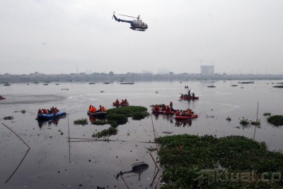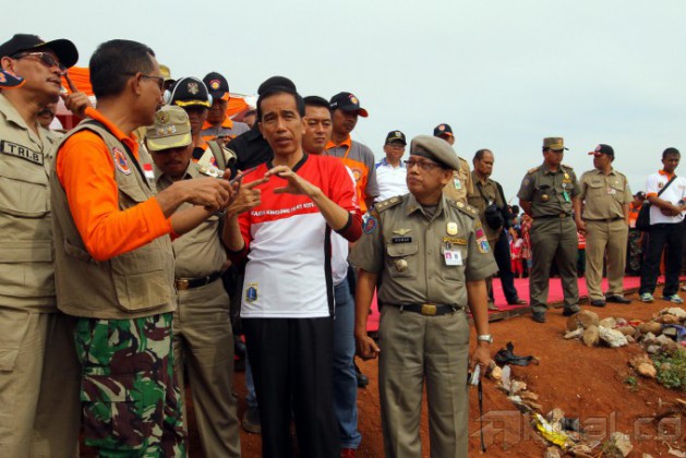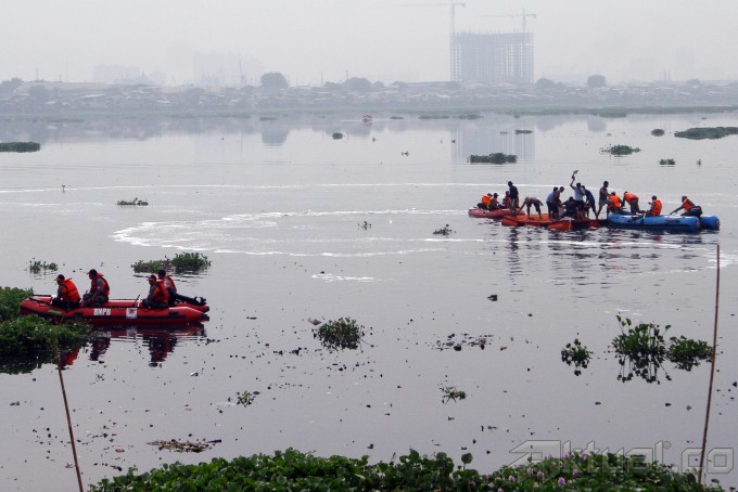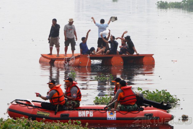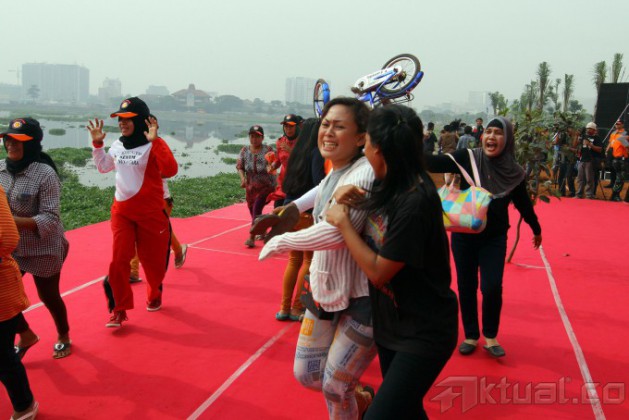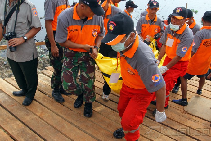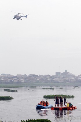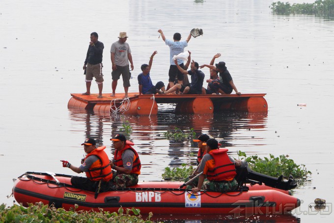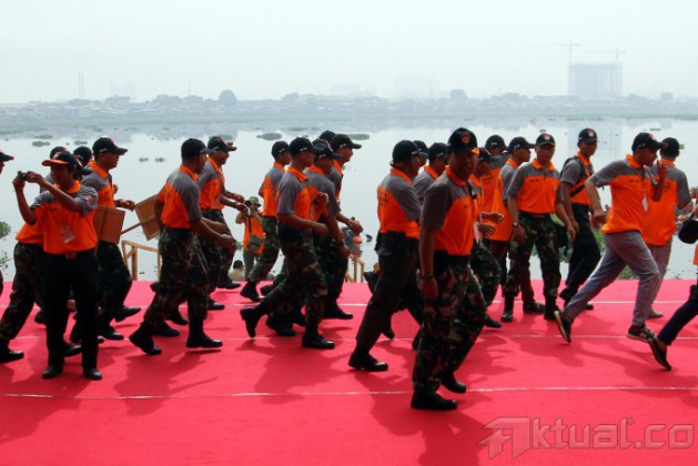 Sejumlah anggota Badan Nasional Penanggulangan Bencana (BNPB) bersama warga melakukan latihan penanggulangan bencana di Pluit, Jakarta Utara, Minggu (8/12/2013). Latihan ini dilakukan untuk menjaga kesiapan warga untuk penanggulangan banjir jika sewaktu-waktu terjadi. Aktual/Tino Oktaviano