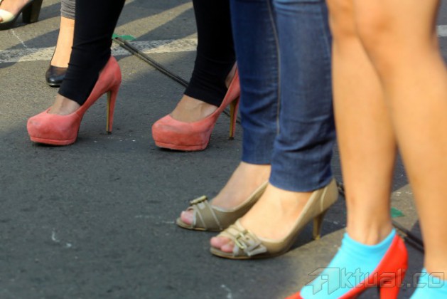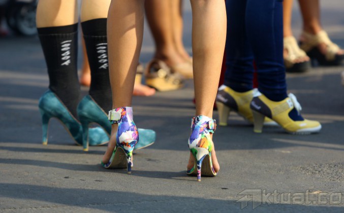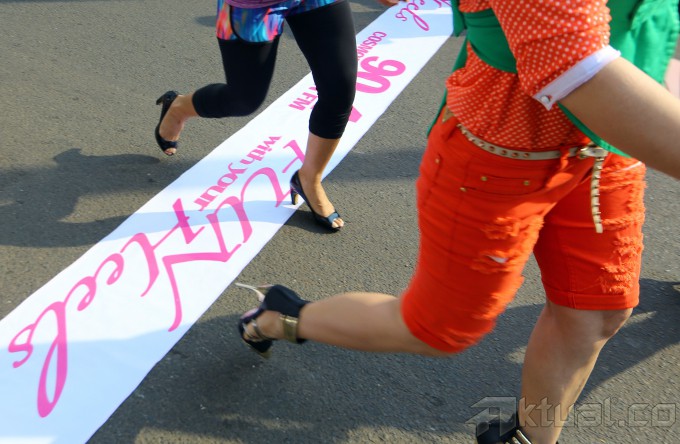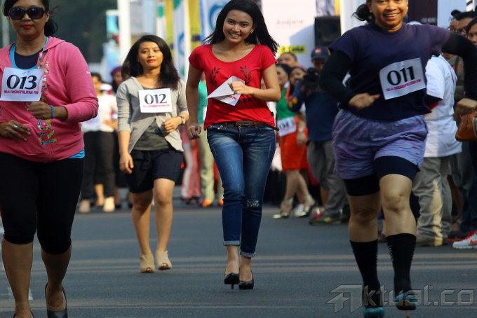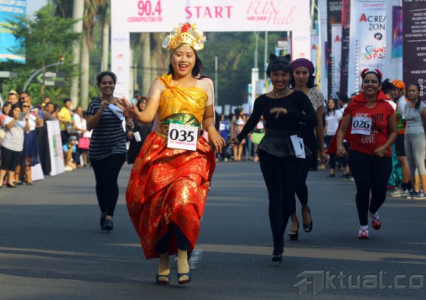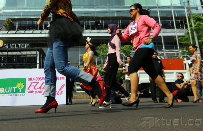 Peserta mengikuti lomba lari dengan menggunakan sepatu high heels di Jalan pintu satu Senayan, Jakarta, Minggu (26/10/2014). Dalam lomba lari unik ini, peserta harus berlari sehauh 100 meter dengan menggunakan sepatu high heels setinggi 7 cm. AKTUAL/TINO OKTAVIANO