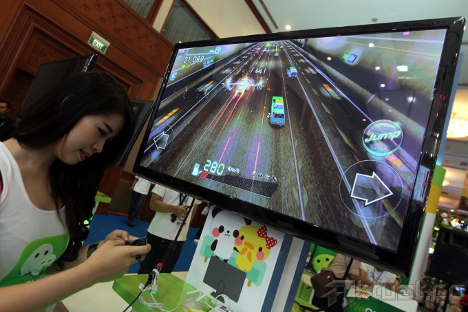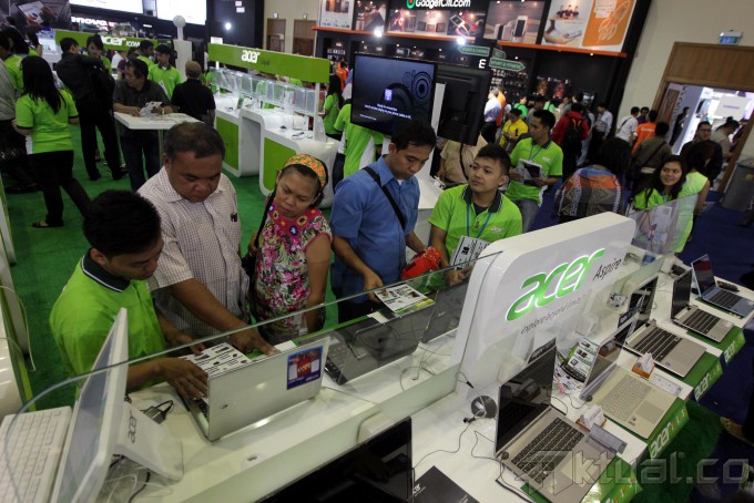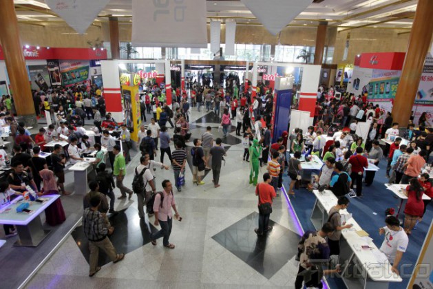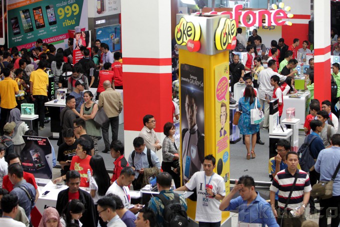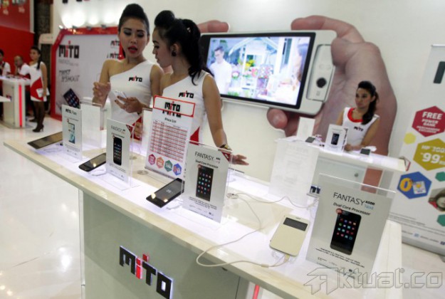 Sejumlah pengunjung mengamati smartphone keluaran baru di pameran Indonesia Cellular Show (ICS) 2014 di JCC, Senayan, Jakarta, Kamis (5/6/2014). Pameran yang diikuti empat operator, enam belas vendor dan enam industri pendukung ini menargetkan 150 ribu pengunjung dengan total transaksi Rp 425 miliar dan dibuka hingga 8 Juni. Aktual/Tino Oktaviano