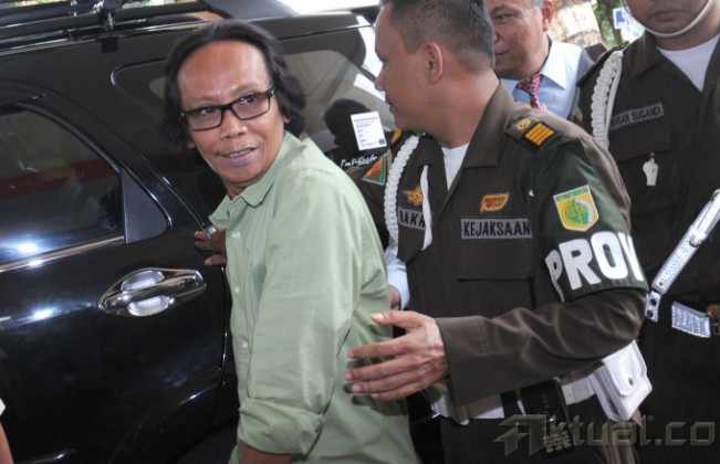 Tersangka kasus dugaan korupsi program siap siar di TVRI yang juga Komedian Betawi Mandra Naih (kiri) dikawal petugas provost saat tiba di Kejaksaan Agung , Jakarta, Rabu (25/2). Kedatangan Mandra ke Kejagung untuk pemeriksaan sebagai saksi bagi dua tersangka Iwan Chermawan selaku Direktur PT Media Art Image serta Yulkasmir selaku pejabat pembuat komitmen di TVRI dalam dugaan kasus penggelembungan dana dalam Program Siap Siar TVRI tahun 2012 yang menggunakan anggaran negara sebesar Rp 47,8 milyar. ANTARA FOTO/Teresia May