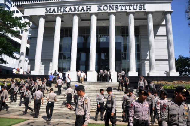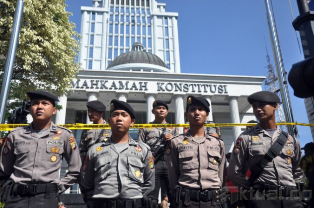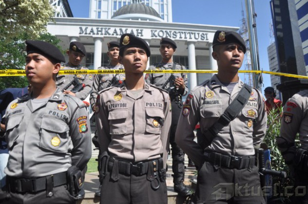 Sejumlah personel Brimob Polda Metro Jaya melakukan pegamanan Gedung MK dengan menggunakan senjata di Jakarta, Rabu (6/8/2014). Petugas kepolisian memperketat keamanan Gedung MK dengan melakukan pengamanan tiga lapis pada sidang perdana gugatan hasil Pilpres 2014 yang diajukan pasangan Prabowo-Hatta. Aktual/Junaidi Mahbub