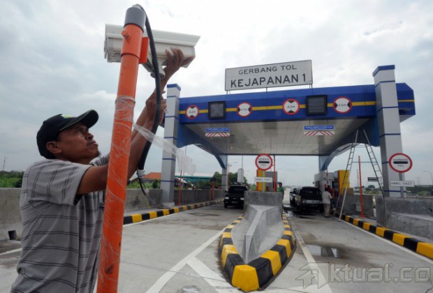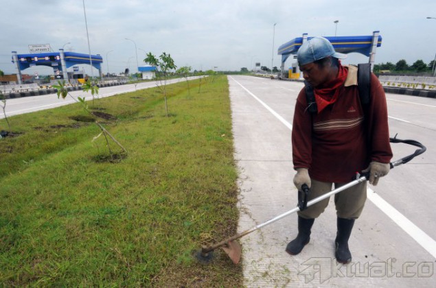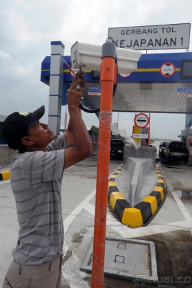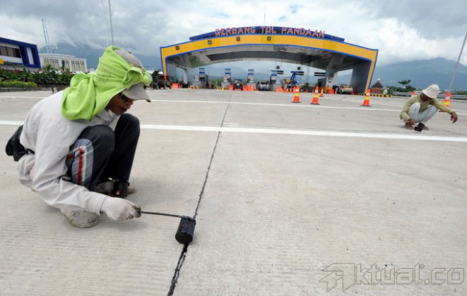 Pekerja mewarnai garis jalan di depan pintu gerbang tol Gempol-Pandaan, di Pandaan, Pasuruan, Jawa Timur, Jumat (13/2). PT Jasa Marga Tbk, melalui anak usahanya, PT Jasa Marga Pandaan Tol, menargetkan Jalan Tol Gempol – Pasuruan sepanjang 13,6 km senilai Rp1,2 triluin itu mulai dioperasikan Maret 2015 karena secara fisik sudash selesai 100 persen. ANTARA FOTO/Audy Alwi