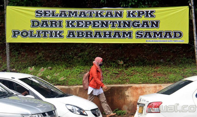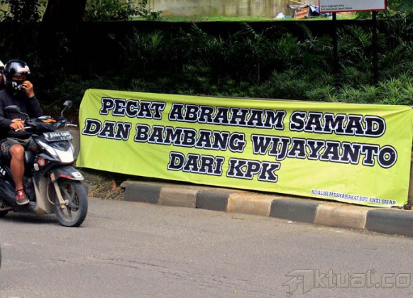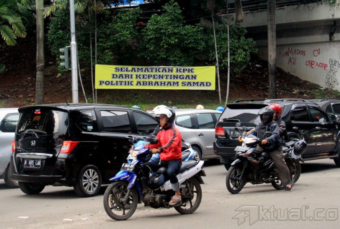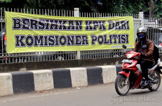 Sebuah spanduk dari Koalisi Masyarakat Anti Suap bertuliskan “Bersihkan KPK dari Komisioner Politisasi” terpampang di jalanan Ibukota, Jakarta, Selasa (27/1/2015). Seruan ini ditujukan agar komposisi baru yang dibentuk diharapkan bisa membersihkan KPK dari komisioner atau pihak yang bermasalah, yang bisa melemahkan KPK. AKTUAL/MUNZIR