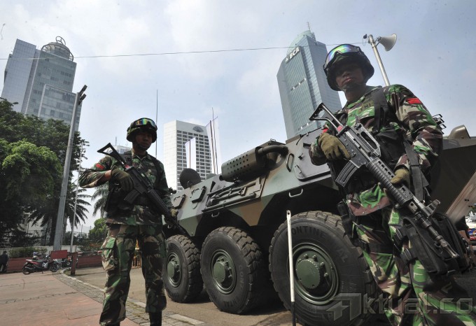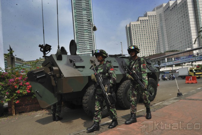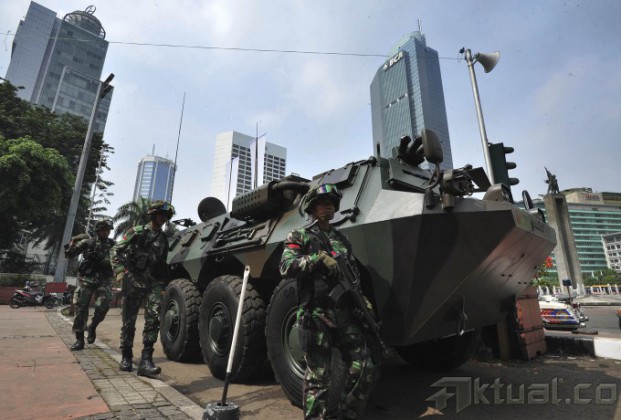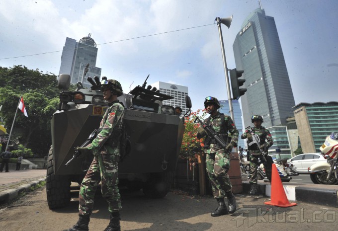 Dua Prajurit Yonif Mekanis 201 Kodam Jaya berjaga di kawasan Bundaran Hotel Indonesia, Jakarta, Selasa (14/4/205). Menjelang pelaksaan peringatan Konferensi Asia Afrika (KAA) ke-60 yang berlangsung KAA yang akan digelar pada 19 – 24 April 2015 tersebut sejumlah titik di wilayah ibukota dijaga pasukan TNI/Polri sebagai antisipasi keamanan wilayah. AKTUAL/TINO OKTAVIANO