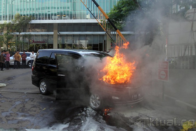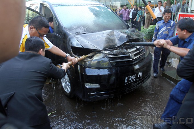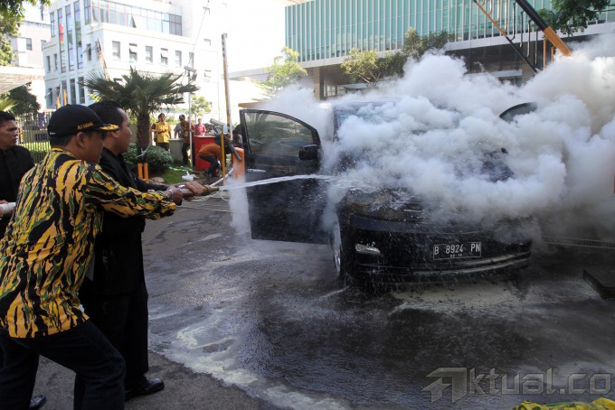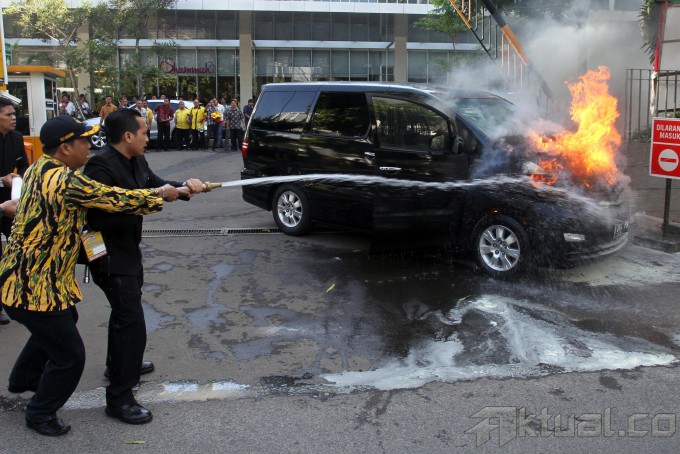 Dua orang berusaha memadamkan api dari sebuah mobil Alphard warna hitam B 8924 PN yang terbakar milik pengurus DPP Partai Golkar yang sedang mengikuti Rapimnas V di depan Hotel JS Luwansa, Jalan HR Rasuna Said, Kuningan, Jakarta Selatan, Jumat (22/11/2013). Peristiwa itu mencuri perhatian kader Partai Golkar yang tengah menggelar Rapimnas di hotel tersebut. Aktua/Tino oktaviano
