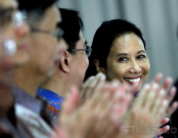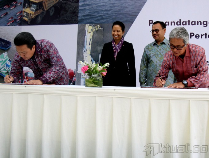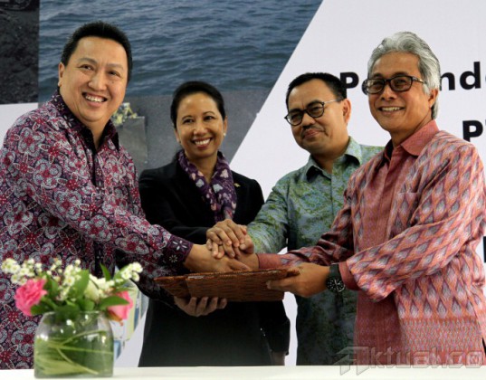 Dari kiri ke kanan, Presiden Direktur PT Adaro Energy Tbk (ADRO) Garibaldi Thohir, Menteri BUMN Rini Soemrno, Menteri ESDM Sudirman Said dan Dirut PT Pertamina (Persero) Dwi Soetjipto bertumpuk tangan usai melakukan tanda tangan kerjasama, di Kementrian ESDM, Jakarta, Rabu (13/5/2015). Kerjasama antara Pertamina dengan Adaro senilai Rp7 triliun dengan kurun waktu 10 tahun ke depan, mengenai pembelian bahan bakar dan pemanfaatan storage. AKTUAL/MUNZIR