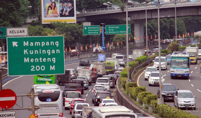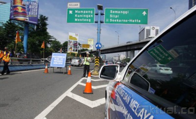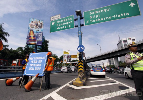 Petugas kepolisian membantu mengalihkan arus keluar pintu tol yang mengarah ke Pancoran di Jakarta, Senin (16/12/2013). Untuk mengurai kemacetan, mulai hari ini dilakukan uji coba penutupan pintu keluar tol tegal parang, pancoran dan dharmais pada pukul 08.00 – 10.00 wib, sedangkan pintu masuk tol Semanggi I akan ditutup pada pukul 16.00 – 20.00 wib. Aktual/Tino Oktaviano