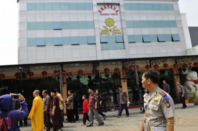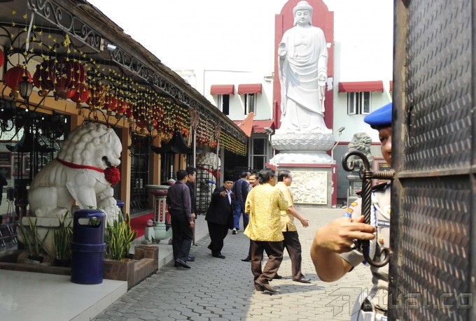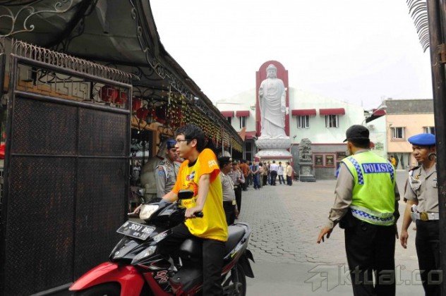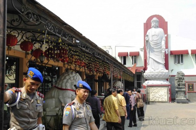 Sejumlah personel Polri melakukan penjagaan di Wihara Ekayana Graha Jalan Mangga II No 8, RT 08/08, Duri Kepa, Kebon Jeruk, Tanjung Duren, Jakarta Barat, Senin (5/8). Ledakan yang diduga bom rakitan tersebut melukai sejumlah jemaat yang berada di tempat itu. Petugas masih melakukan olah TKP dan mengumpulkan bukti-bukti di lapangan untuk mengungkap siapa pelaku ledakan bom ini. Aktual/Tino Oktaviano