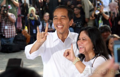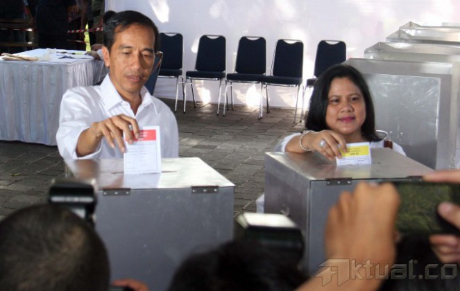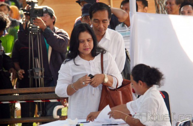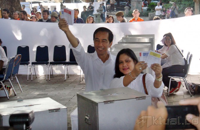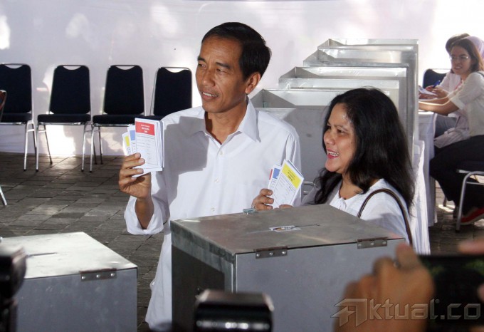 Gubernur DKI Jakarta, Joko Widodo (Jokowi), yang juga bakal capres dari PDIP (kiri) bersama istrinya Iriana menunjukan jari mereka yang telah dicelup tinta usai memberi suaranya di TPS 27 Menteng, Jakarta Pusat, Rabu (9/4/2014). Pemilu legislatif dilaksanakan serempak di seluruh tanah air untuk memilih wakil di DPR, DPRD I, DPRD II dan DPD. Aktual/Tino Oktaviano