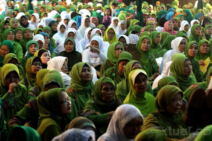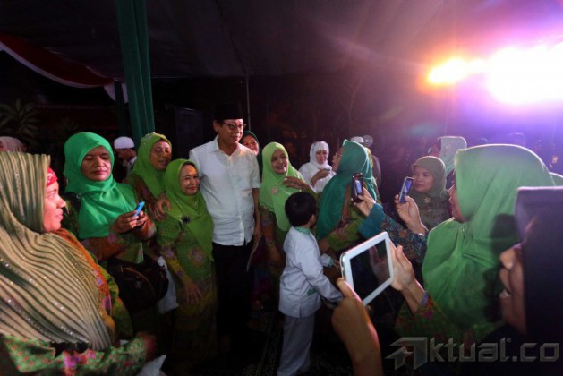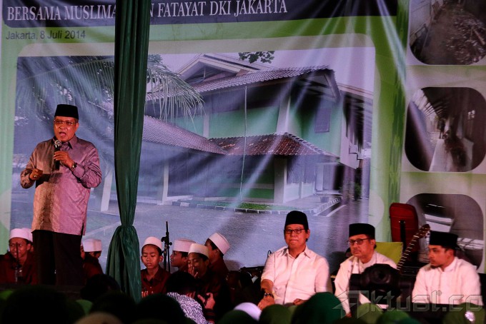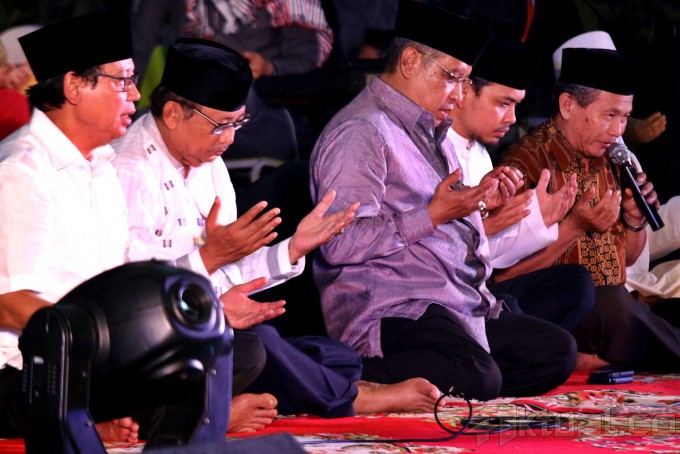 Ketua PBNU Said Aqil Siradj (dua kanan), Ketua Tanfidziyah PBNU Djan Faridz (kiri) dan Ketua PWNU DKI Jakarta Robby Budiansyah (dua kanan) berdoa usai melakukan buka puasa bersama ribuan muslimat dan Fatayat NU di Jakarta, Selasa (8/7/2014). Dalam kesempatan tersebut para muslimat dan Fatayat NU DKI Jakarta melakukan doa bersama untuk kemaslahatan bangsa serta dapat menggunakan hak pilihnya dalam Pilpres 2014. Aktual/Tino Oktaviano