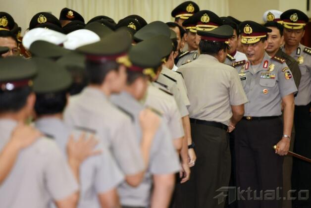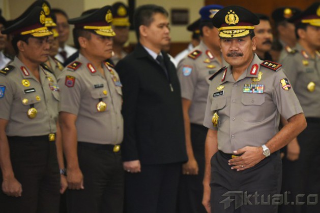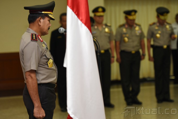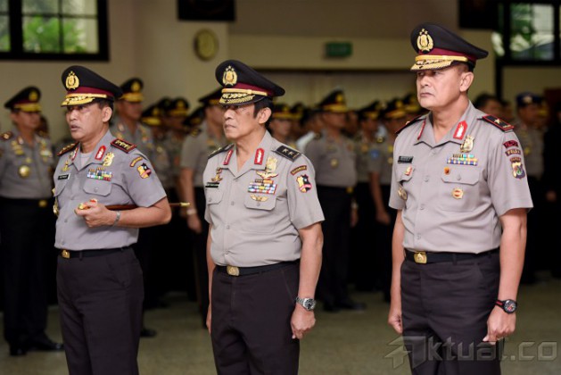 Kepala Badan Reserse Kriminal Mabes Polri Komjen Pol Budi Waseso (kiri) didampingi Irjen Pol Deddy Fauzi Elhakim (tengah) dan Brigjen Rudolf Alberth Rodja (kanan) mengikuti upacara kenaikan pangkat perwira tinggi di Mabes Polri, Jakarta, Kamis (5/2). Selain melantik Budi Waseso, Wakapolri Komjen Badrodin Haiti juga melantik 12 perwira tinggi Polri, dua di antaranya berpangkat Inspektur Jenderal (Irjen) Pol dan 10 lainnya berpangkat Brigadir Jenderal (Brigjen) Pol. ANTARA FOTO/M Agung Rajasa
