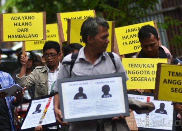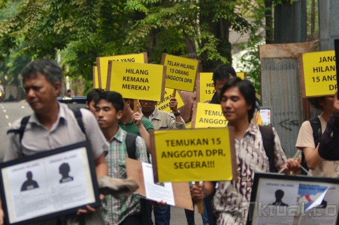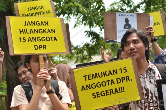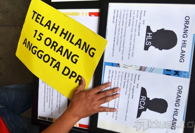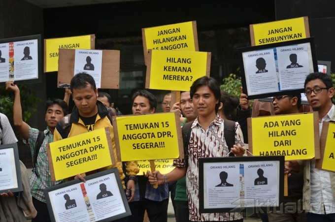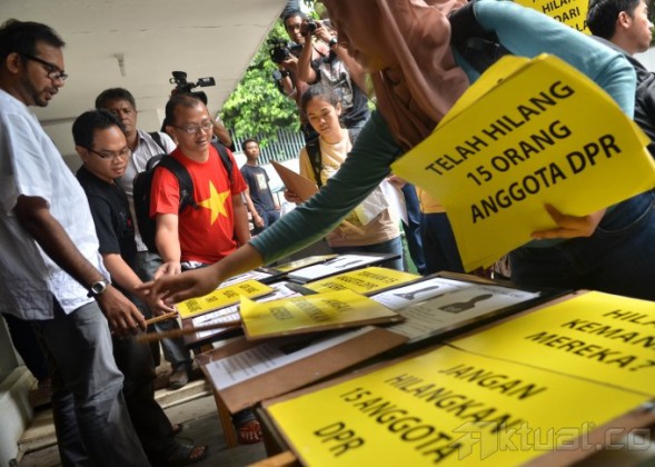 Sejumlah Aktivis Indonesia Coruption Watch (ICW) dan Komisi Untuk Orang Hilang dan Korban Tindak Kekerasan (KontraS) yang mengatas namakan Koalisi Masyarakat Sipil Anti-Korupsi menggelar aksi di Markas KontraS, Jakarta, Senin (2/9). Koalisi Masyarakat Sipil Anti-Korupsi menyambangi KontraS, terkait hilangnya 15 nama anggota DPR yang sebelumnya tercantum dalam hasil audit Badan Pemeriksa Keuangan (BPK) tahap II proyek Hambalang Juli 2013. Aktual/Tino Oktaviano