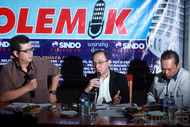 Staf Khusus Presiden Bidang Luar Negeri, Teuku Faizasyah (tengah), didampingi Wakil Ketua Komisi I DPR dari Fraksi Demokrat Ramadhan Pohan (kanan) saat diskusi polemik di Warung Daun, Cikini, Jakarta, Sabtu (9/11/2013). Kabar dugaan penyadapan yang dilakukan Amerika Serikat (AS) dan Australia diharapkan menjadi momentum untuk mengevaluasi kinerja aparat intelijen Indonesia. Aktual/Tino Oktaviano
