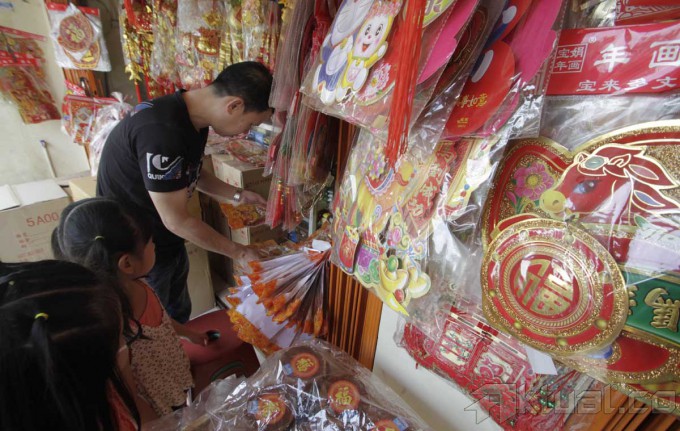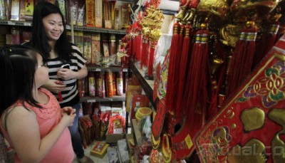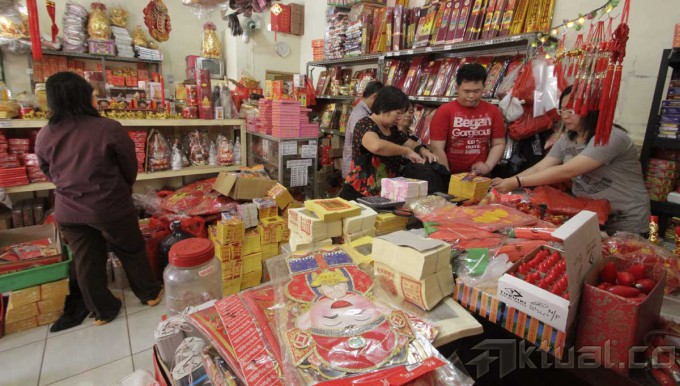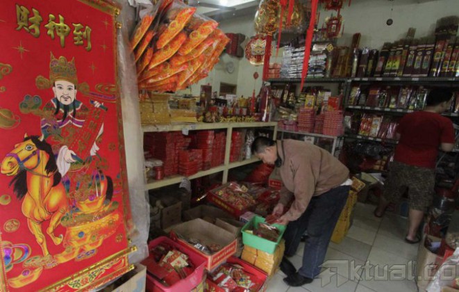 Kesibukan penjual pernak-pernik Imlek dikawasan pecinan jalan Mayor Oking kota Bekasi Minggu, 26 Januari 2014. Sepekan menjelang perayaan Imlek penjualan pernak-pernik mengalami peningkatan meskipun harga jual relatif mahal akibat kenaikan harga produk yang sebagian merupakan barang impor. Aktual/Bagas Triputro