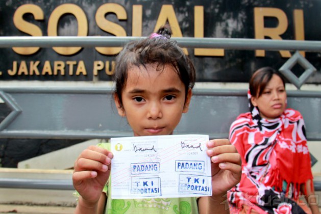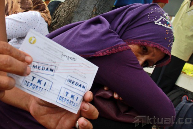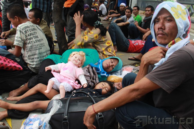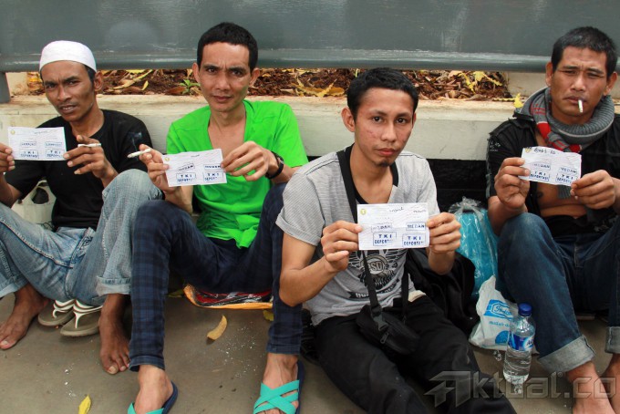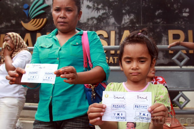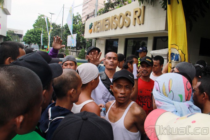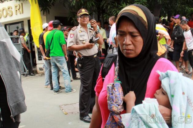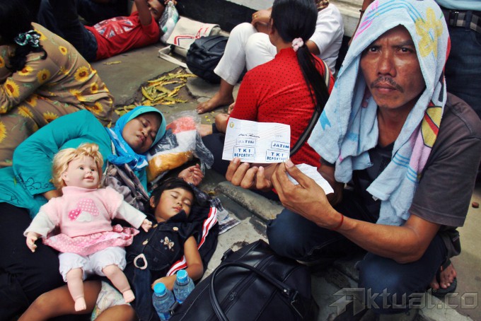 Ribuan Tenaga Kerja Indonesia (TKI) yang di deportasi dari Malaysia menuntut uang dari pemerintah yang dijanjikan di Kementerian Sosial, Jakarta, Senin (25/11/2013). Saat ini pemerintah Malaysia telah mendeportasi sebanyak 7.590 TKI bermasalah termasuk puluhan anak-anak menuju Tanjung Priok, Jakarta. Aktual/Tino Oktaviano