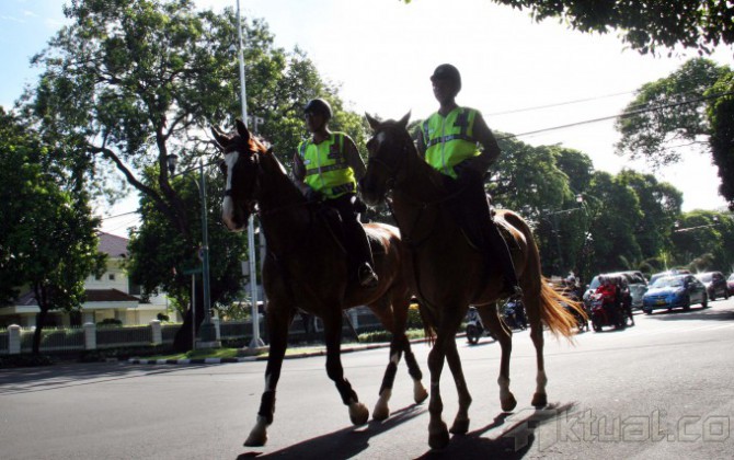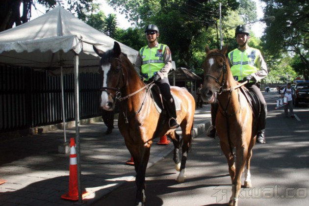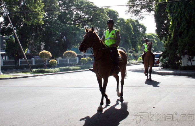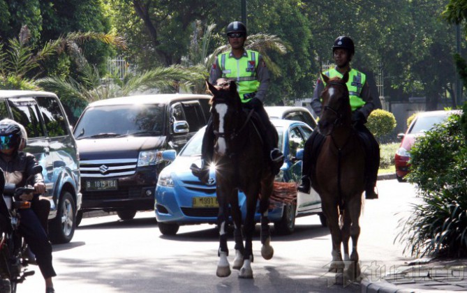 Dua personil polisi berkuda dari unit Badan Pemeliharaan Keamanan (Baharkam) Mabes Polri berpatroli di kawasan menteng Jakarta Pusat, Rabu (9/4/2014). Pasukan berkuda itu bukan hanya berpatroli di TPS itu saja, melainkan juga mengawasi keamanan kawasan Menteng Jakarta Pusat. Penggunaan kuda dinilai paling efektif untuk membubarkan jika ada aksi massa yang dapat berpotensi menimbulkan kericuhan. Aktual/Tino Oktaviano