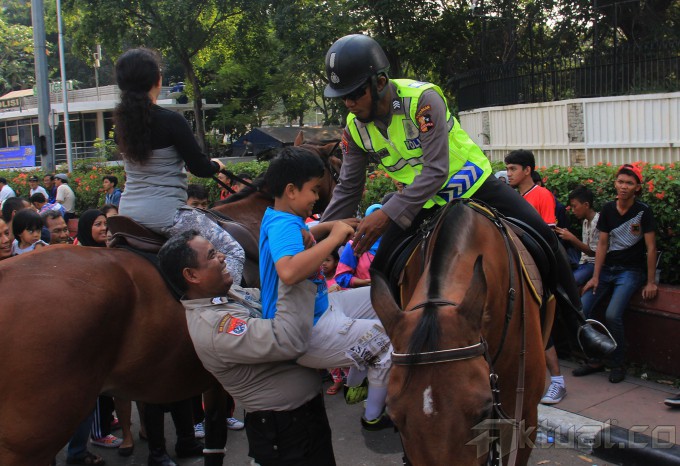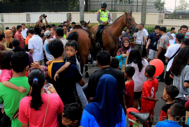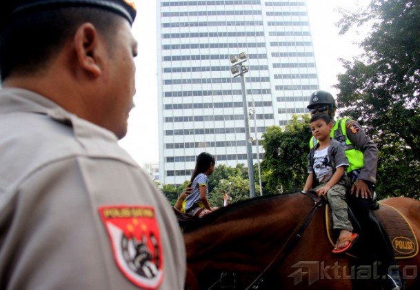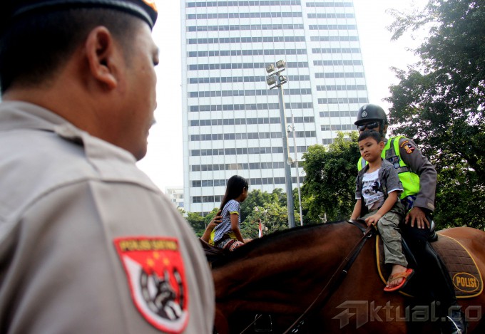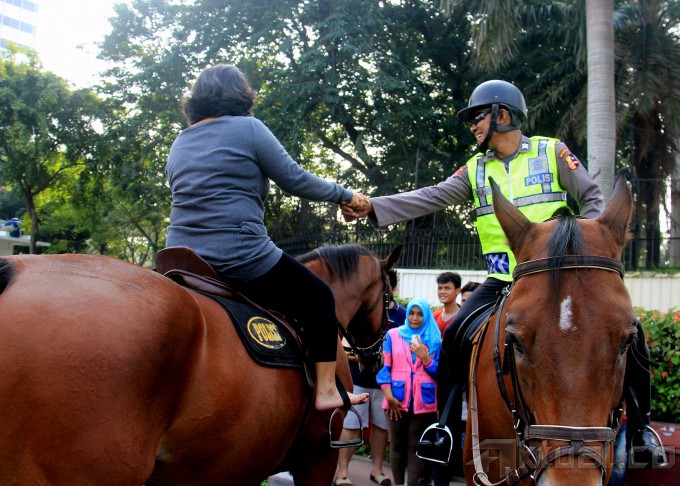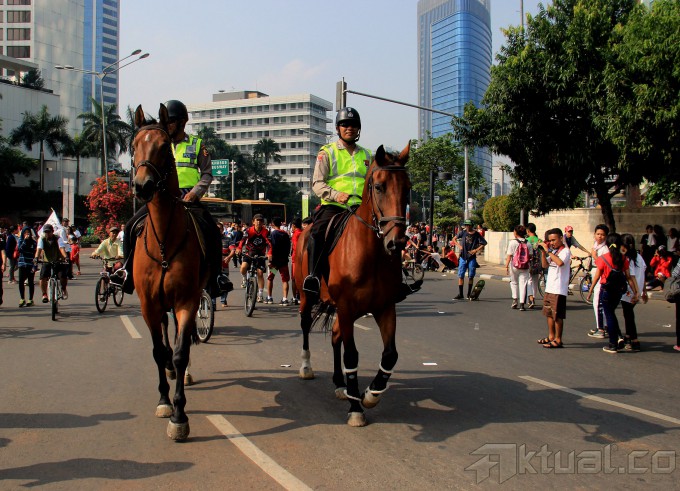 Polisi berkuda berpatroli di area car free day, di sekitar bundaran HI Jakarta Pusat, Minggu (31/5/2015). Patroli dilakukan untuk menjaga keamanan dan ketertiban bagi masyarakat yang sedang menikmati acara bebas kendaraan bermotor ini. AKTUAL/MUNZIR