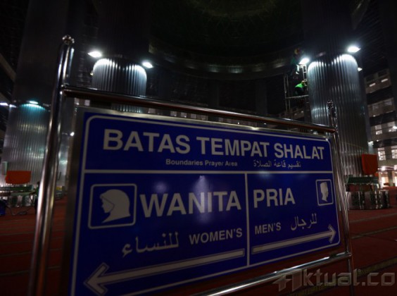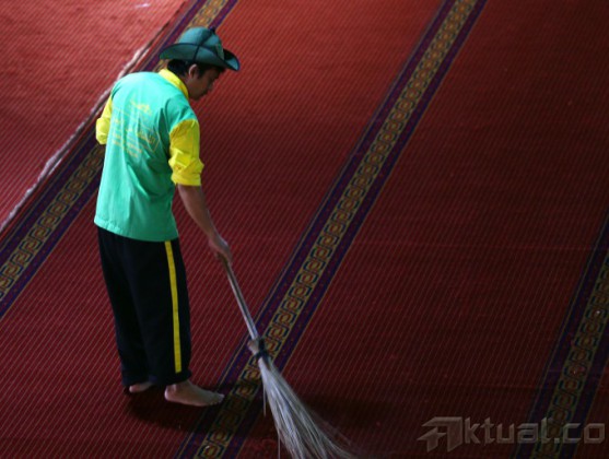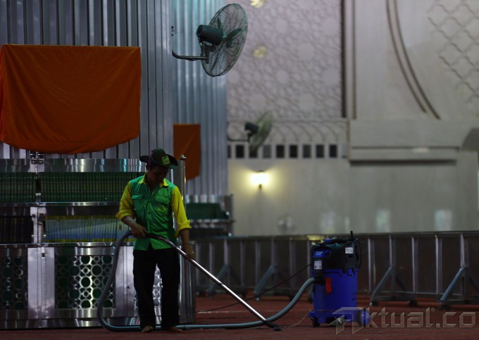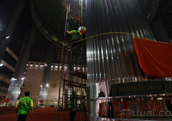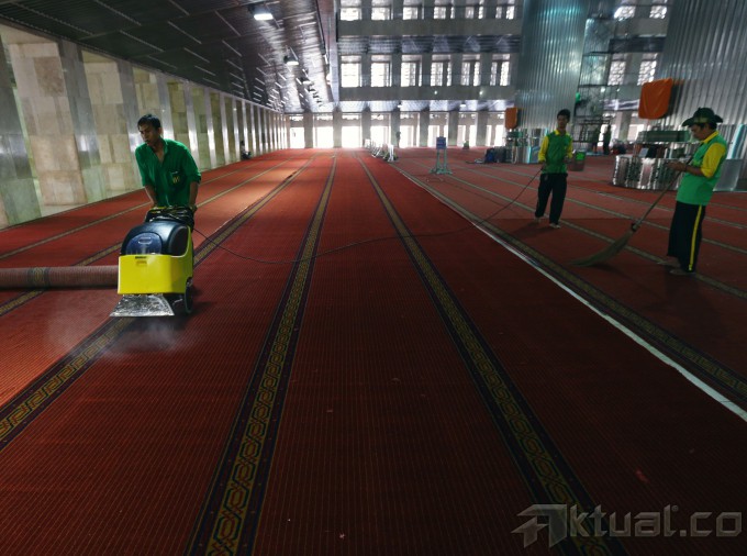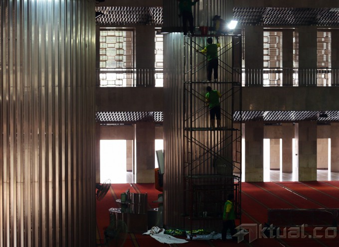 Pekerja membersihkan pilar yang berada didalam masjid Istiqal, Jakarta, Kamis (21/5/2015). Kegiatan pembersihan tiang tersebut guna menyambut bulan suci Ramadan yang jatuh pada pertengahan Juni yang akan datang. AKTUAL/MUNZIR