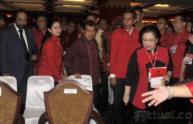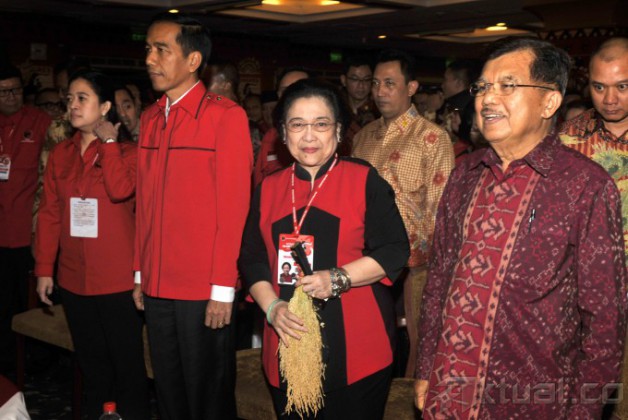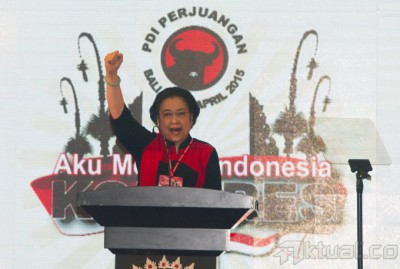Ketua Umum PDI Perjuangan Megawati Soekarnoputri menyampaikan pidato politik saat pembukaan Kongres IV PDI Perjuangan, di Hotel Inna Grand Bali Beach, Bali, Kamis (9/4). Kongres PDI Perjuangan dengan salah satu agenda pokok yakni menetapkan Megawati Soekarnoputri sebagai Ketua Umum PDI Perjuangan periode 2015-2020 akan berlangsung dari tanggal 8-12 April 2015. ANTARA FOTO/Andika Wahyu