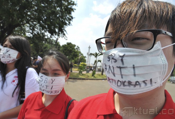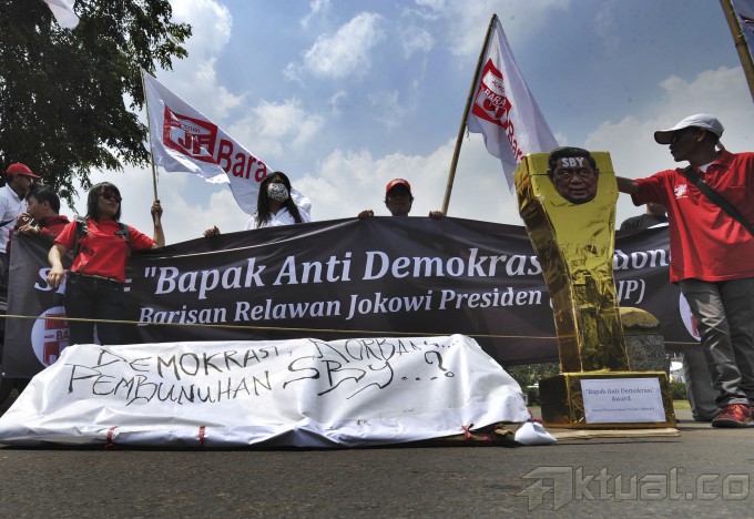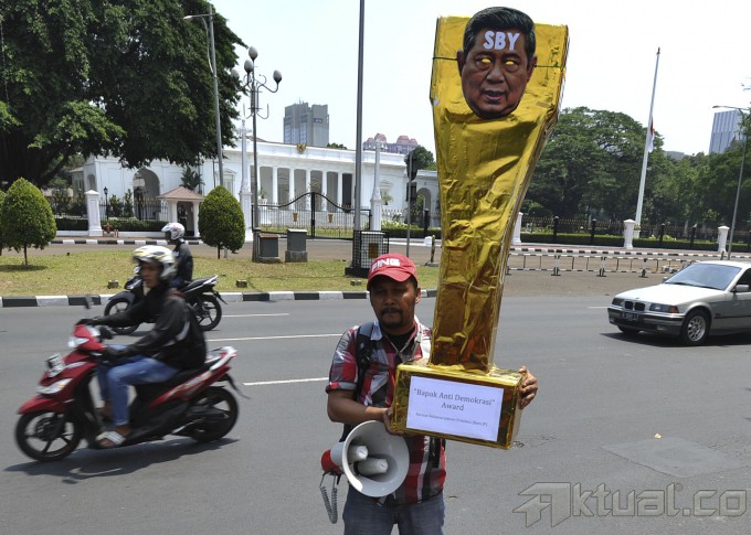 Relawan Jokowi JK Bara JP melakukan aksi unjuk rasa dengan memberikan piala penghargaan bapak anti demokrasi di Depan Istana Negara, Jakarta, Selasa (29/9/2014). Aksi ini sebagai bentuk kekecewaan atas disahkannya UU Pilkada. AKTUAL/TINO OKTAVIANO