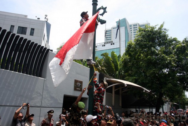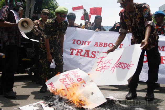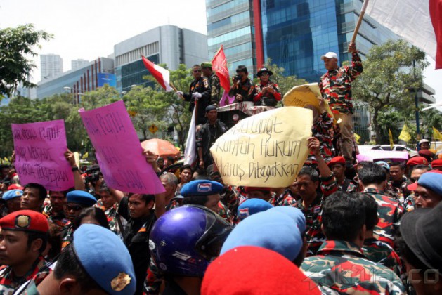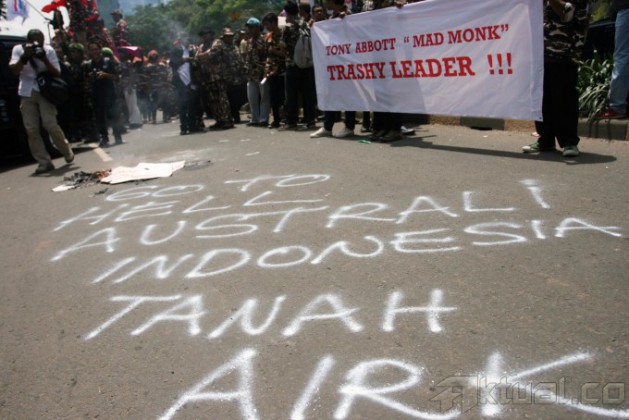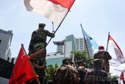 Sejumlah massa yang tergabung dalam Laskar Merah Putih dan Gerakan Muda Forum Komunikasi Putra Putri dan Putra Putri Purna TNI melakukan aksi di depan kantor Kedutaan Australia, Jalan HR Rasuna Said, Jakarta Selatan, Kamis (2111/2013). Laskar Merah Putih, mengecam aksi penyadapan kepada Petinggi Negara dan mendesak pemutusan hubungan diplomatik dengan Australia, negara yang telah melanggar kedaulatan NKRI. Aktual/Tino Oktaviano