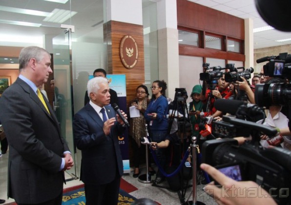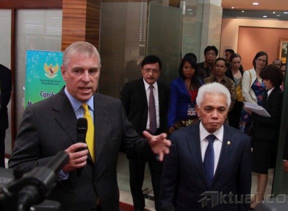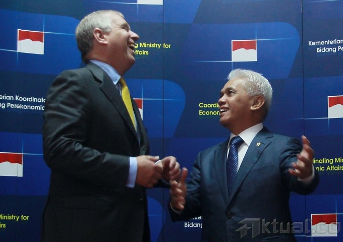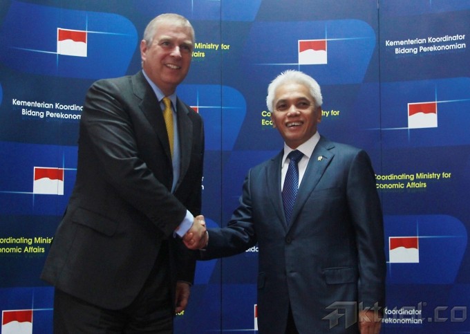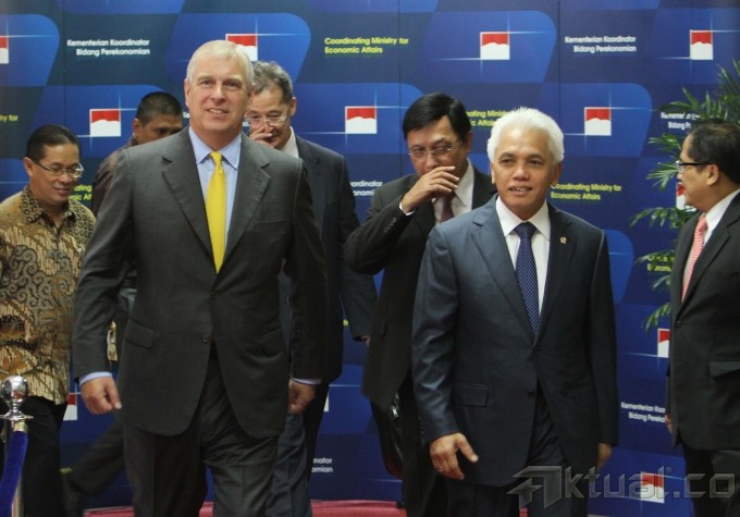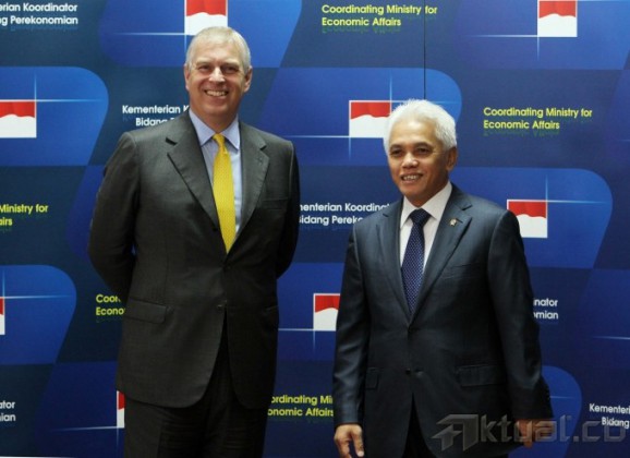 Menteri Koordinator Perekonomian Hatta Rajasa, berbincang dengan Putera kedua Ratu Elizabeth II, Pangeran Andrew saat menerima pangeran yang bergelar “Duke of York” di kantor Kementerian Koordinator Perekonomian, Jakarta, Rabu (18/9/2013). Kunjungan Andrew tersebut difokuskan untuk memperdalam hubungan bilateral Inggris-Indonesia di sektor perdagangan, investasi, sains, inovasi serta pendidikan. Aktual/Tino Oktaviano