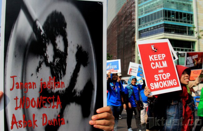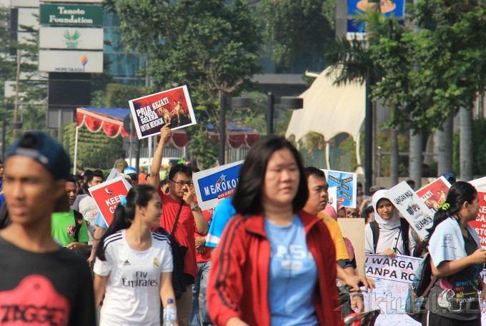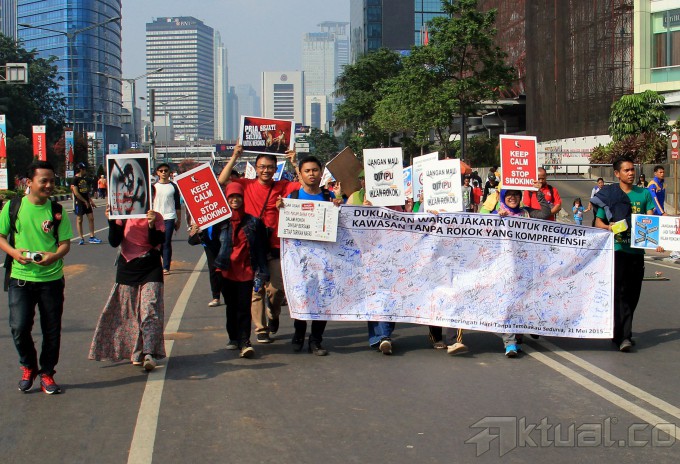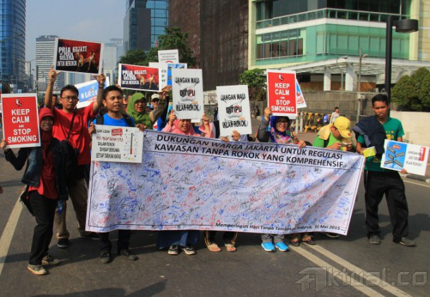 Puluhan masyarakat yang tergabung dalam Masyarakat Peduli Tanpa Rokok (MPTK) melakukan aksi kampanye Peringatan Hari Tanpa Rokok Sedunia, di Car Free Day, Jakarta, Minggu (31/5/2015). Dalam Aksi kampanyenya Hari Tanpa Rokok Sedunia membawa poster yang bersikan dukungan warga Jakarta untuk regulasi kawasan tanpa rokok yang komprehensif. AKTUAL/MUNZIR
