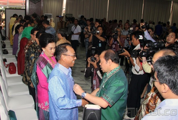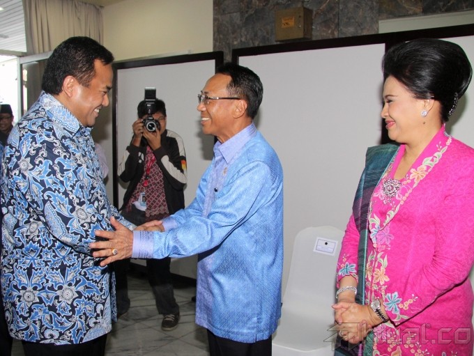 Menteri Energi dan Sumber Daya Mineral Jero Wacik (kiri) didampingi Istri saat acara halal bihalal di gedung Kementerian ESDM, Jakarta, Selasa (13/8). Tampak dalam acara tersebut jajaran petinggi Kementerian ESDM, Kepala SKK Migas Rudi Rubiandini, Ketua Komisi VII DPR RI, Sutan Bhatoegana, Direktur Utama Pertamina, Karen Agustiawan, dan banyak petinggi perusahaan kontraktor pertambangan. Aktual/Tino Oktaviano