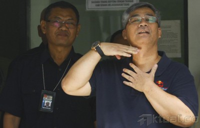 Mantan Ketua MK, Akil Mochtar mempraktekan adegan potong leher saat memberikan hak suaranya di TPS Rutan KPK, Rabu (9/7/2014). Sejumlah tahanan koruptor bersama-sama nyoblos pilpres, diantaranya Anas Urbaningrum, Lutfhi Hasan berserta tahanan lainnya. Aktual/Tino Oktaviano