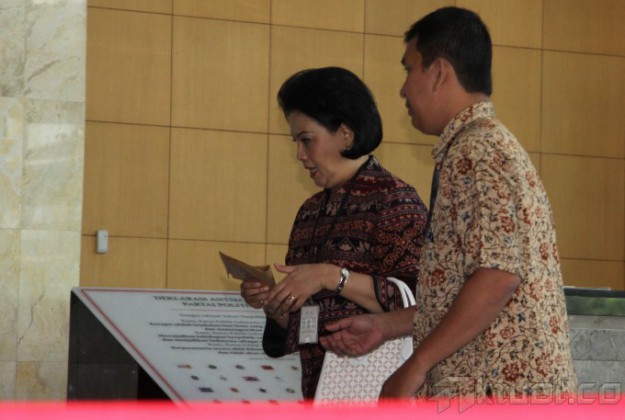 Istri Jero Wacik, Triesna Jero Wacik saat tiba di Gedung KPK, Jakarta, Selasa (16/9/2014). Kedatangan Triesna ke Gedung KPK ini guna memenuhi panggilan penyidik untuk diperiksa sebagai saksi atas tersangka mantan Menteri Energi dan Sumber Daya Mineral (ESDM) Jero Wacik dalam kasus pemerasan di Kementerian ESDM. AKTUAL/JUNAIDI MAHBUB
