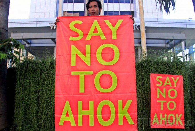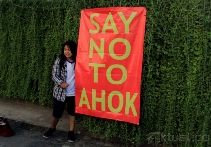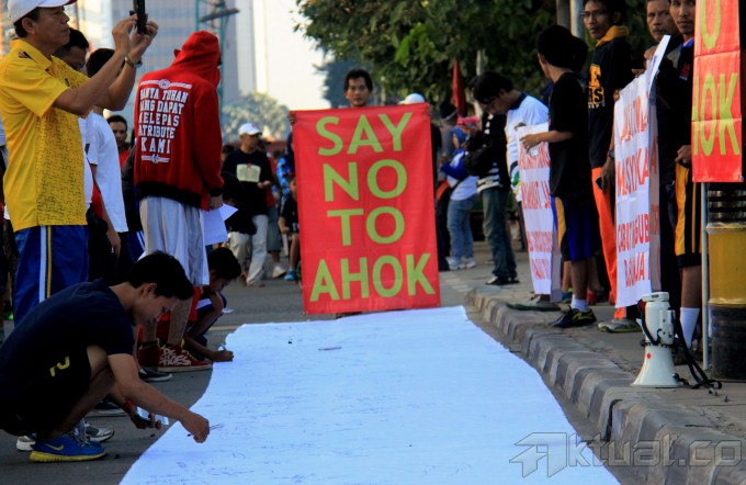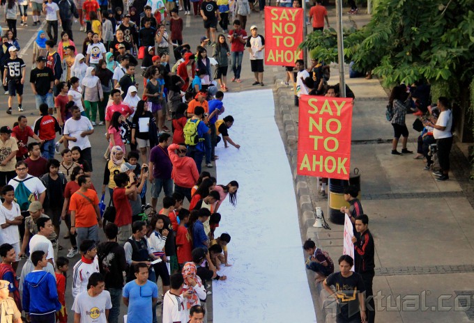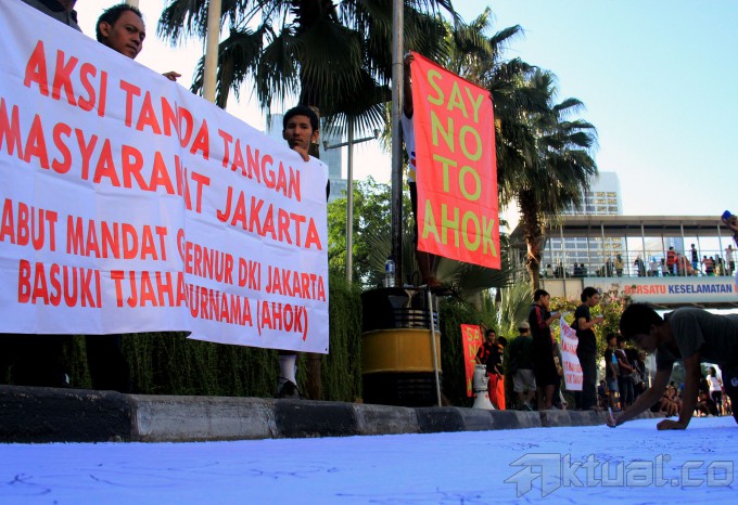 Sejumlah warga membubuhkan tanda tangan mendukung pemakzulan Gubernur DKI Jakarta Basuki Tjahaja Purnama alias Ahok di Bundaran Hotel Indonesia, Jakarta, Minggu (22/2/2015). Mereka melakukan aksi ini karena kebijakan Ahok dinilai tak pro-rakyat. AKTUAL/MUNZIR
