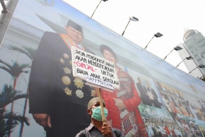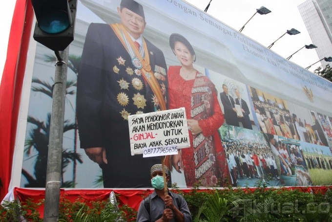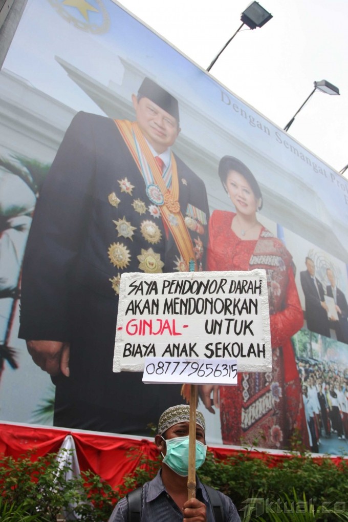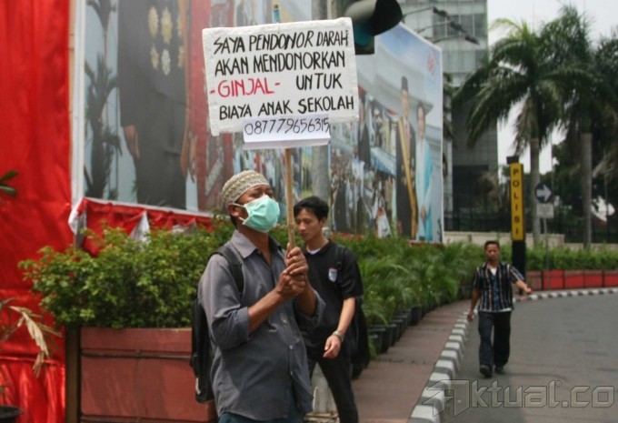 Dwi Waryono (48) asal Puwakarta, Jawa Barat menawarkan organ tubuh ginjal kepada pengguna jalan di kawasan Bundaran Hotel Indonesia, Jakarta, Senin (12/8). Dwi menawarkan ginjal dirinya seharga Rp 3 juta, untuk membiayai masuk anak sekolah, karena dia di PHK dari pabrik tekstil sekitar dua bulan. Aktual/Tino Oktaviano