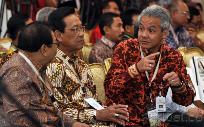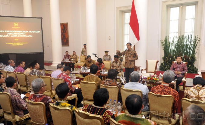 Presiden Joko Widodo menghadiri pertemuan kelima dengan Bupati se-Indonesia di Istana Bogor, Jawa Barat, Jumat (13/2). Pertemuan dengan Bupati Wilayah Jawa dan Maluku serta Gubernur di Pulau Jawa tersebut dilakukan agar rencana pembangunan nasional bisa sejalan dengan kebijakan di seluruh daerah. ANTARA FOTO/Andika Wahyu