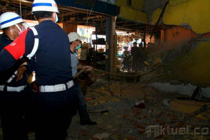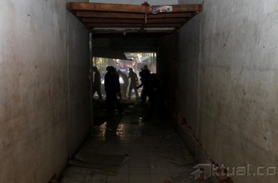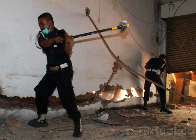 Sejumlah petugas tengah membongkar dinding kios saat melakukan penertiban di Stasiun Cikini, Jakarta, Kamis (22/8). Pembongkaran kios yang dilakukan aparat gabungan tersebut merupakan kebijakan program revitalisasi perbaikan sarana dan prasarana PT Kereta Api Indonesia (PT KAI) Daops I. Aktual/Oke Dwi Atmaja