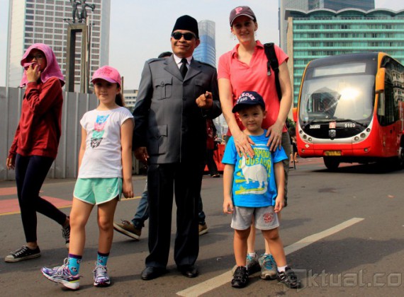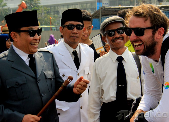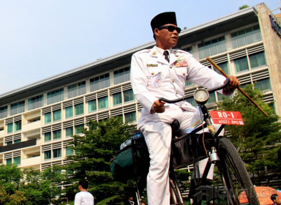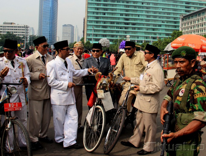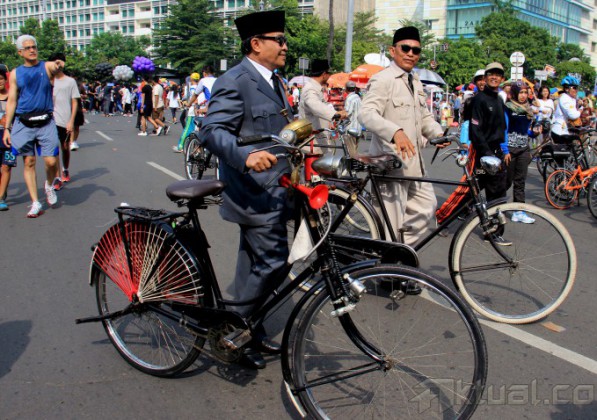 Peserta Komunitas Sepeda Ontel Jakarta mengenakan kostum bergaya Presiden RI pertama Soekarno saat acara Car Free Day di Jakarta , Minggu ( 7/6/2015). Bung Karno palsu ini memakai kostum tersebut dalam rangka memperingati hari lahirnya Bung Karno yang ke 114 jatuh pada tanggal 6 juni. AKTUAL/MUNZIR