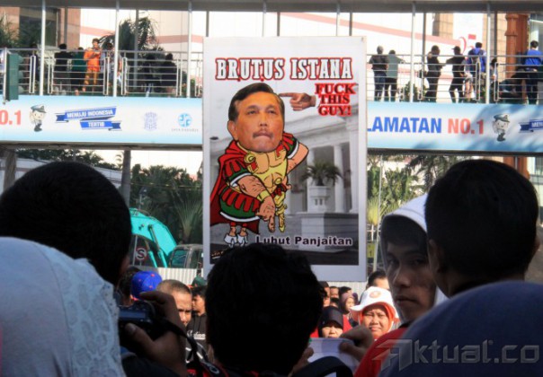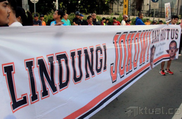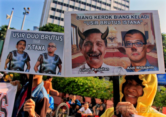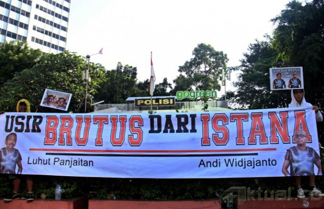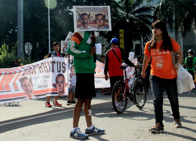 Relawan Jokowi melakukan aksi Usir Brutus Istana meminta Presiden Joko Widodo (Jokowi) segera mencopot Sekretaris Kabinet, Andi Widjajanto dan Kepala Staff Kepresidenan, Luhut Binsar Panjaitan dari jabatan masing-masing, di acara Car Free Day, Jakarta, Minggu (22/2/2015). Keduanya dituding ingin menjatuhkan Presiden Jokowi dalam kisruh yang terjadi antara Polri dan KPK. AKTUAL/MUNZIR