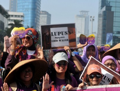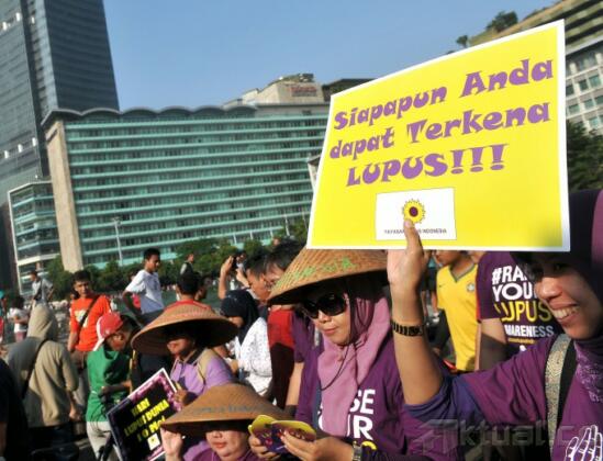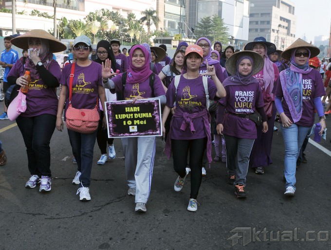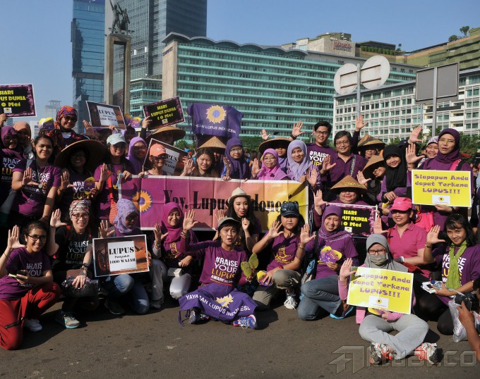 Warga yang tergabung dalam Yayasan Lupus Indonesia melakukan kampanye saat acara Car free Day di kawasan Buderan HI, Jakarta, Minggu (10/5/2015). Kampanye tersebut untuk memperingati Hari Lupus dan YLI juga memberikan sosialisasi kepada masyarakat tentang penyakit lupus. AKTUAL/MUNZIR