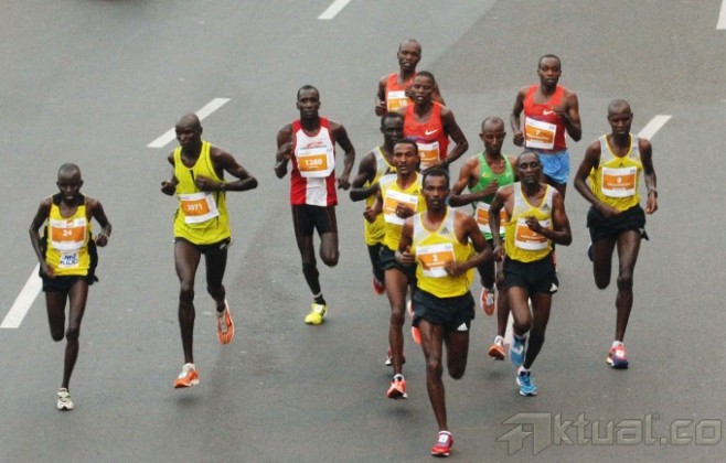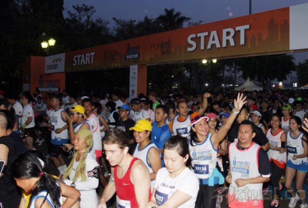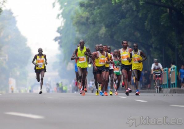 Sejumlah pelari saat mengikuti Jakarta Marathon, Jakarta, Minggu (27/10/2013). Jakarta Marathon memperlombakan beberapa kategori diantaranya full marathon (42,195 kilometer), half marathon (21 km), 10 K, dan 5 K yang diikuti sekitar 10 ribu peserta, 22 peserta diantaranya merupakan atlet dunia dan memperebutkan total hadiah sekitar Rp 2,5 milliar. Aktual/Tino Oktaviano