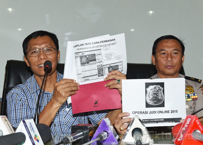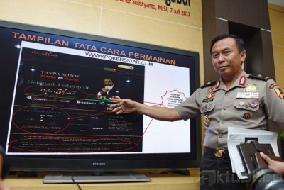 Kepala Biro Penerangan Masyarakat (Karopenmas) Mabes Polri Brigjen Pol. Agus Rianto menunjukkan tampilan situs judi online saat rilis pengungkapan jaringan perjudian online dan tindak pidana pencucian uang di Bareskrim , Mabes Polri, Jakarta, Jumat (22/5). Bareskrim Polri menemukan 360 situs judi online dan telah memblokir 460 rekening yang diduga milik bandar judi tersebut. ANTARA FOTO/Hafidz Mubarak A