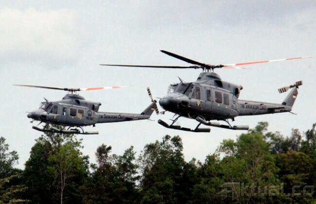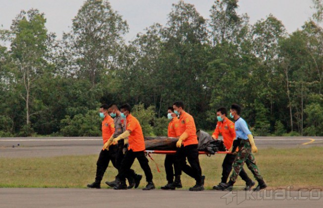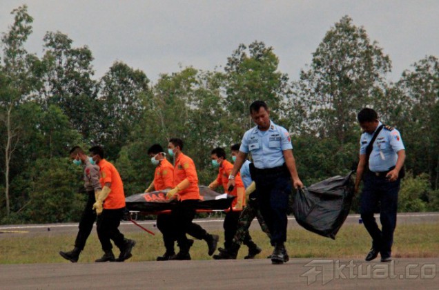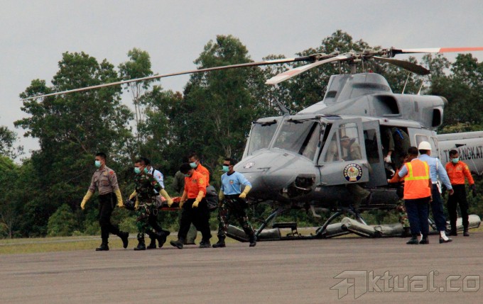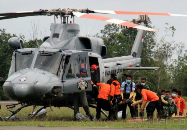 Dua helikopter TNI AL menurunkan empat jenazah dan kantong hitam serpihan pesawat AirAsia QZ8501, yang dibawa KRI Yos Sudarso di Lanud Iskandar, Pangkalan Bun, Kalimantan Tengah. Sabtu (3/1/2015). Jenazah langsung dibawa ke RSUD Sultan Ismanuddin, Pangkalan Bun, Kalimantan Tengah untuk di identifikasi oleh tim DVI. AKTUAL/MUNZIR