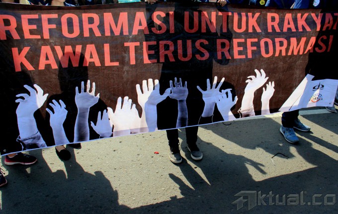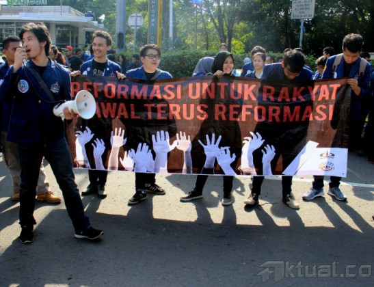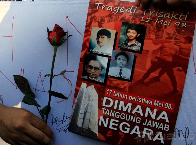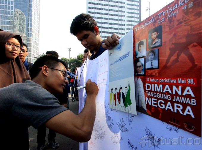 Puluhan Mahasiswa Trisakti yang tergabung dalam Kepresidenan Mahasiswa Trisakti melakukan aksi di Jakarta, Minggu (10/5/2015). Mahasiswa mengajak masyarakat untuk mengingat kembali tragedi 12 Mei 1998. AKTUAL/MUNZIR