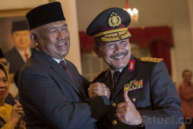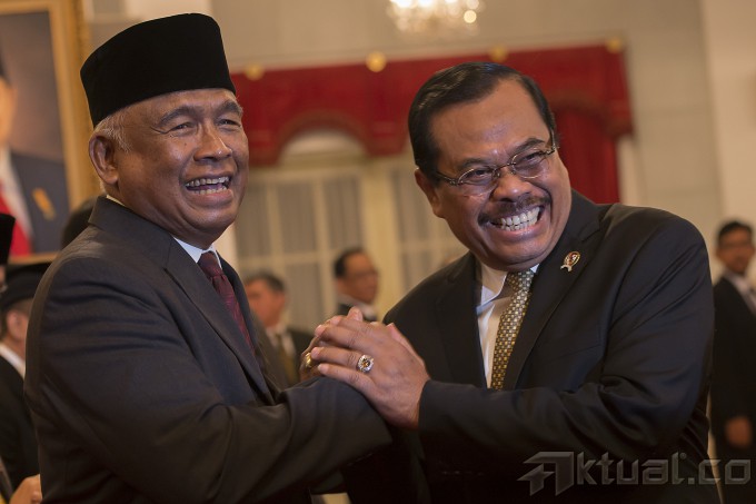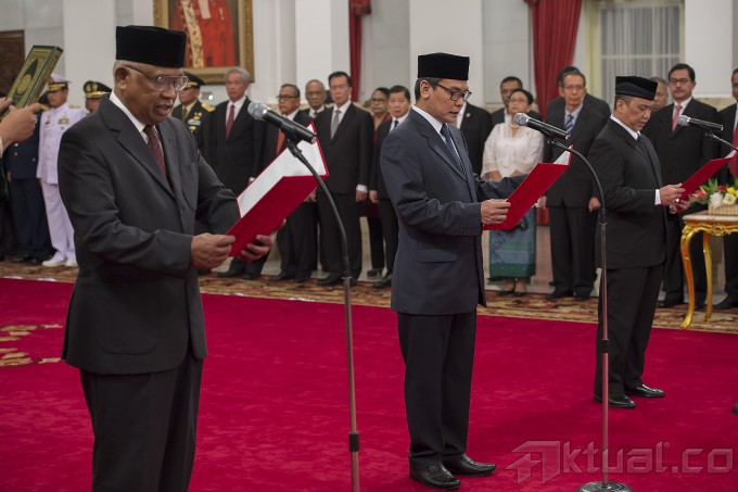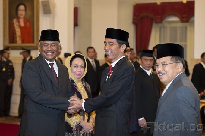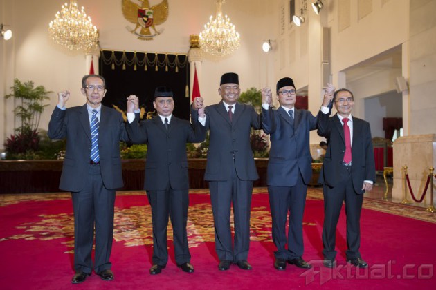 Presiden Joko Widodo (kedua kanan) dan Wapres Jusuf Kalla (kanan) memberikan ucapan selamat kepada Ketua sementara KPK, Taufiequrachman Ruki (kiri) yang didampingi isteri Ny. Atti Risaltri (kedua kiri) usai pengucapan sumpah jabatan di Istana Negara, Jakarta, Jumat (20/2). Presiden Joko Widodo menunjuk mantan Ketua KPK Taufiequrachman Ruki, Deputi Pencegahan KPK Johan Budi SP dan Pakar Hukum Pidana Universitas Indonesia Indriyanto Seno Adji sebagai pimpinan baru sementara KPK. ANTARA FOTO/Widodo S. Jusuf